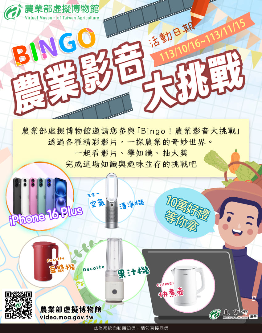 網站提供豐富多元農業影音資源,主題包含政策、氣象、科技、青農、旅遊、食農、食譜、保育、防疫和成果等,歡迎大家踴躍參加