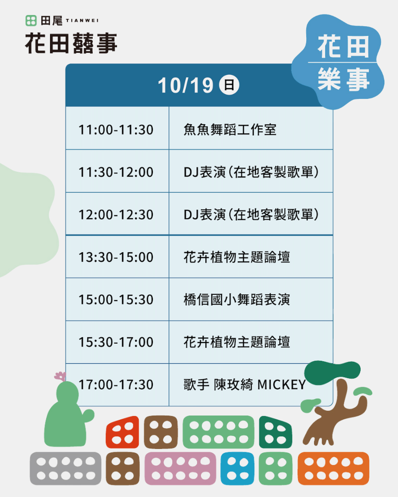 (二)花漾行:114年10月25日(星期六)下午1時30分至3時,於怡心園廣場與親子公園舉行。
