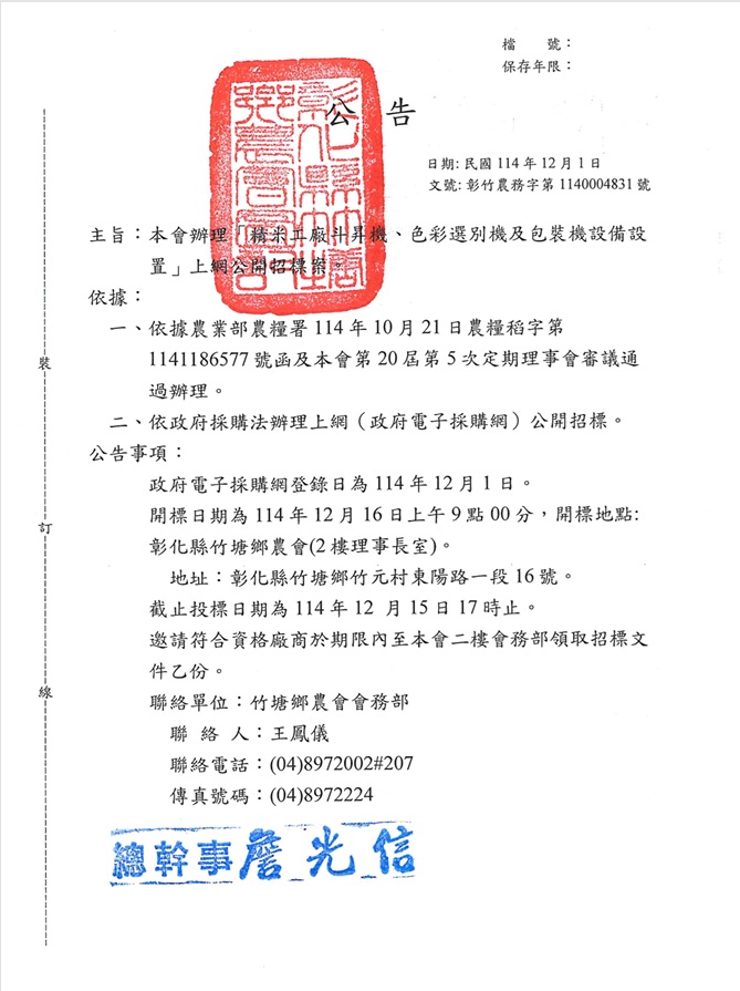 公司名稱:彰化縣竹塘鄉農會 公司統編:60493909