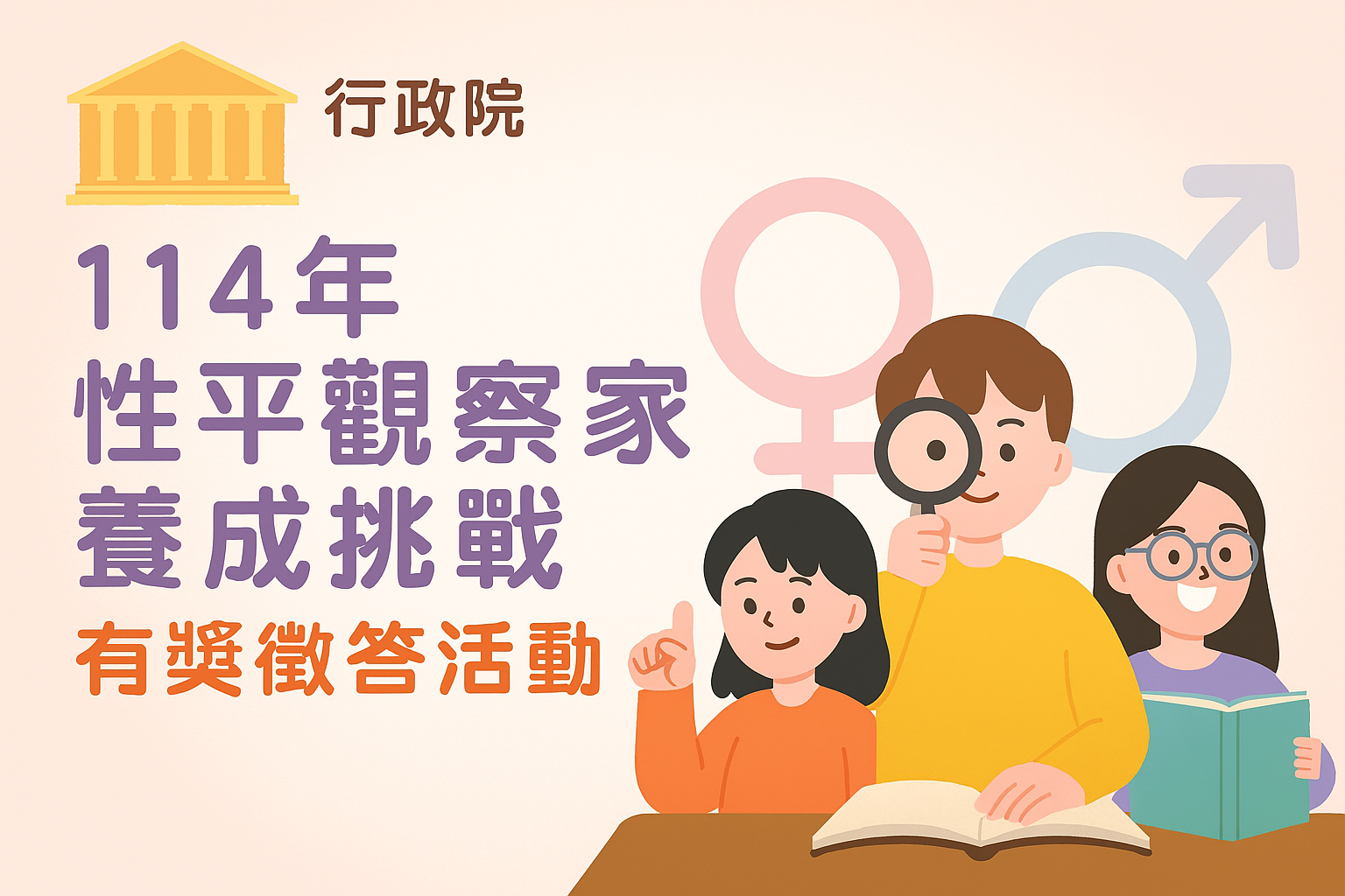 行政院自即日起至 114 年 12 月 31 日止,辦理「114 年性平觀察家養成挑戰」有獎徵答活動,活動分為「機關組團體競賽」及「社會組個人競賽」兩類,歡迎踴躍參與。