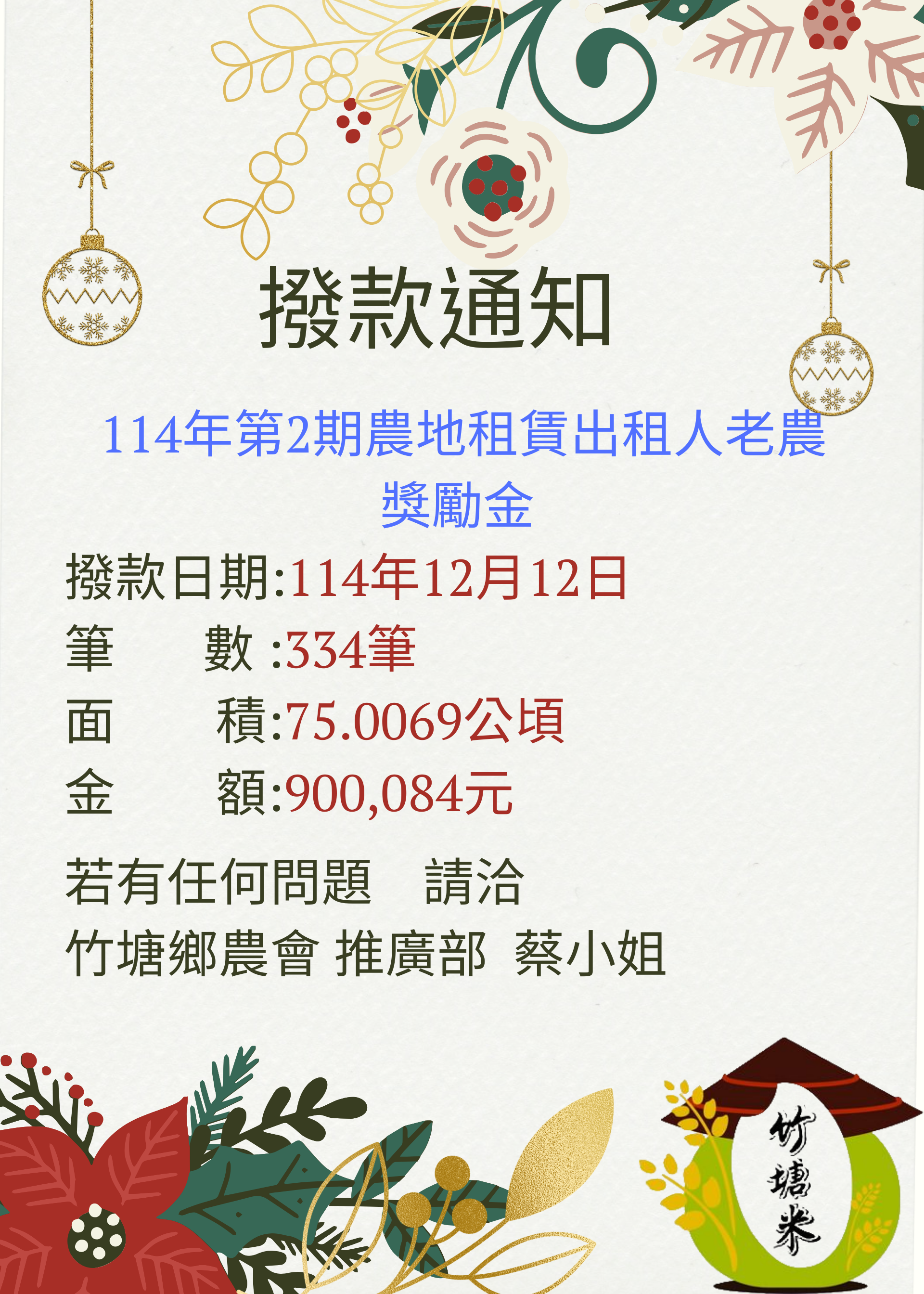 撥款通知-114年第2期農地租賃出租人老農獎勵金