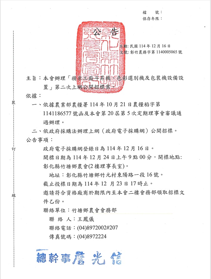 公告本會精米廠色彩選別機、斗升機、包裝機採購公告