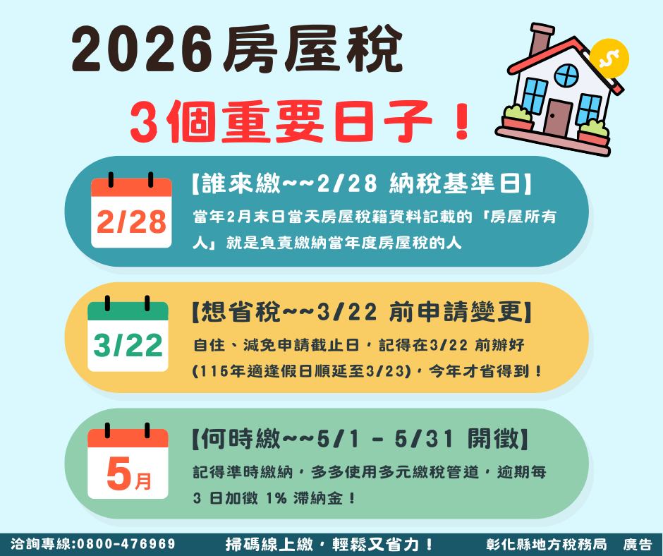 轉知-彰化縣地方稅務局資訊-2026房屋稅3個關鍵日