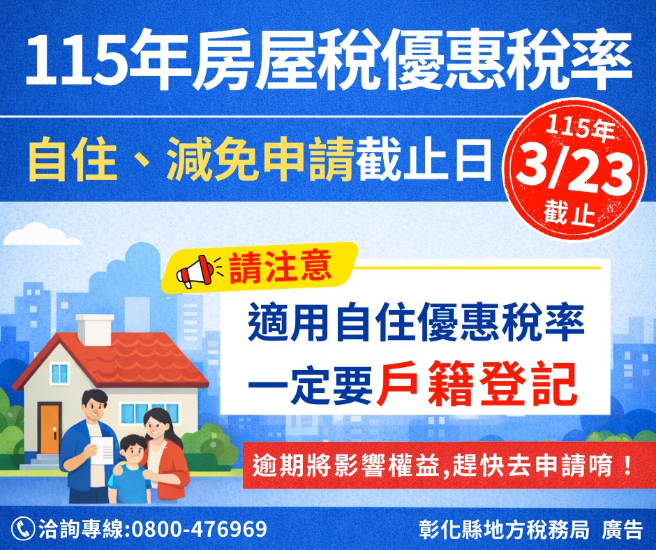呼籲115年房屋稅符合自住、減免條件者,請於115年3月23日前提出申請,守護權益輕鬆省。