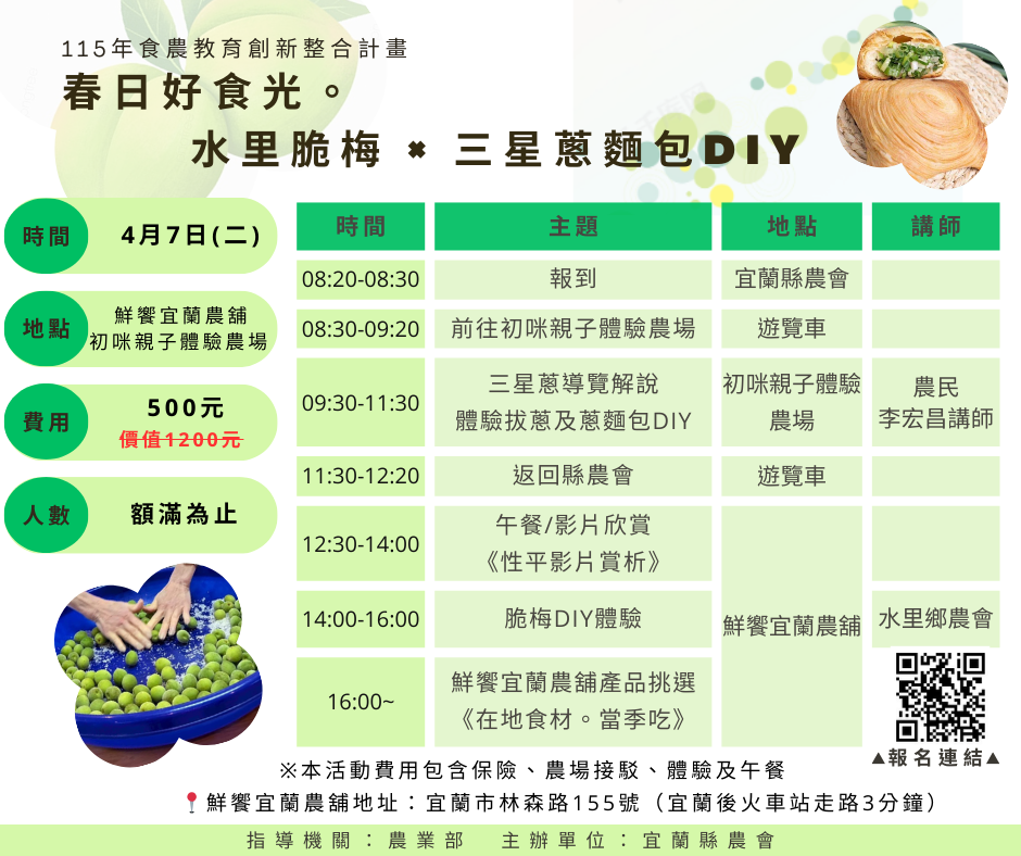 宜蘭縣農會-「春日好食光。水里脆梅 × 三星蔥麵包DIY」食農體驗活動,歡迎踴躍報名參加!